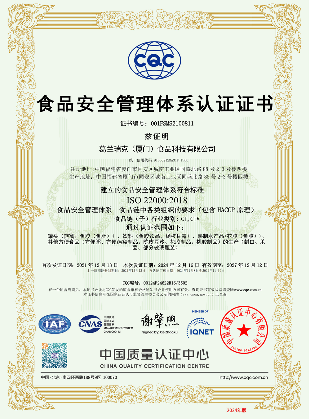 ISO22000体系认证证书(中文)