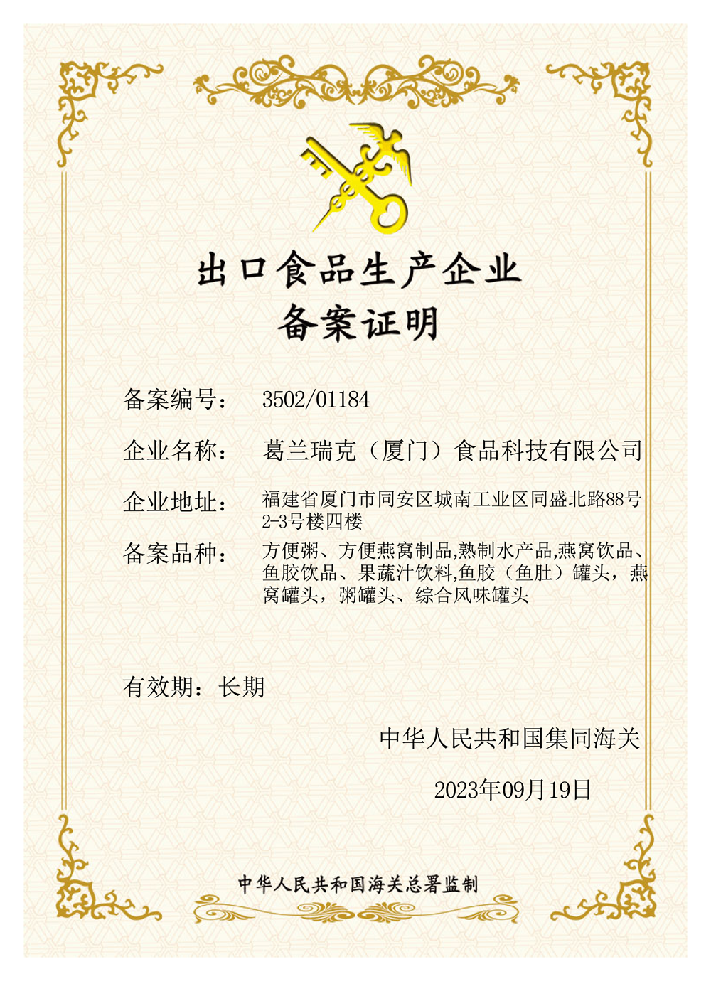 出口食品生产企业备案证明