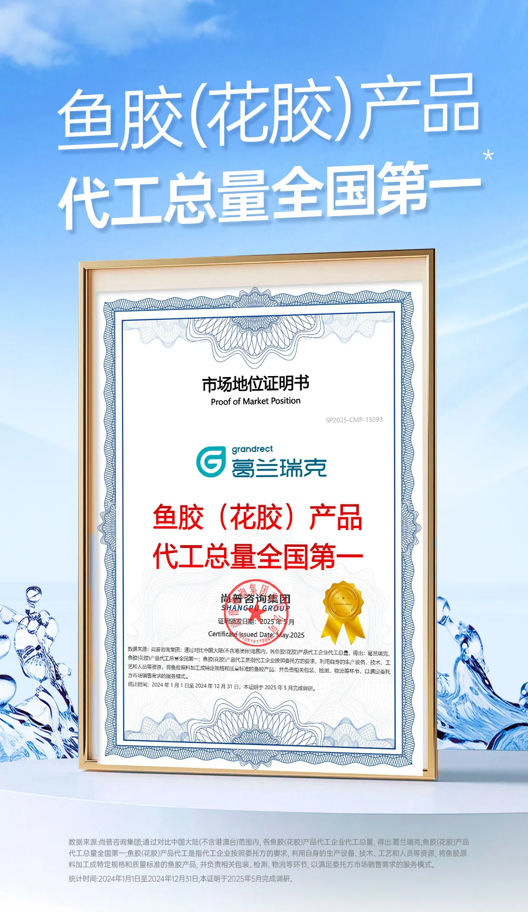在国内,葛兰瑞克建成2万㎡智能超级工厂,拥有8条全自动生产线、日产能60万碗/瓶,通过BRC/IFS欧盟双认证及多项国际食安标准,以“智造”护航每一份产品的稳定与安全,并斩获 “鱼胶(花胶)代工总量全国第一” 的行业认证。
