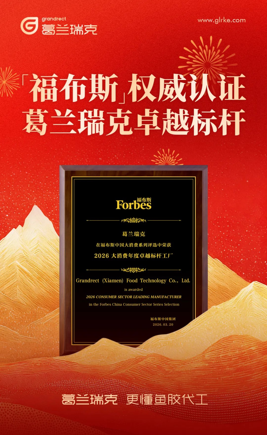 而葛兰瑞克,作为中国滋补代工领域的主要企业,以智造实力与核心担当,不仅深度参与这场产业盛会,更一举摘得「2026大消费年度卓越标杆工厂」大奖!这份荣誉,是福布斯中国与整个大消费行业对其代工综合实力的荣耀加冕,更是葛兰瑞克以全链优势定义行业标准、推动产业升级的实力见证!
