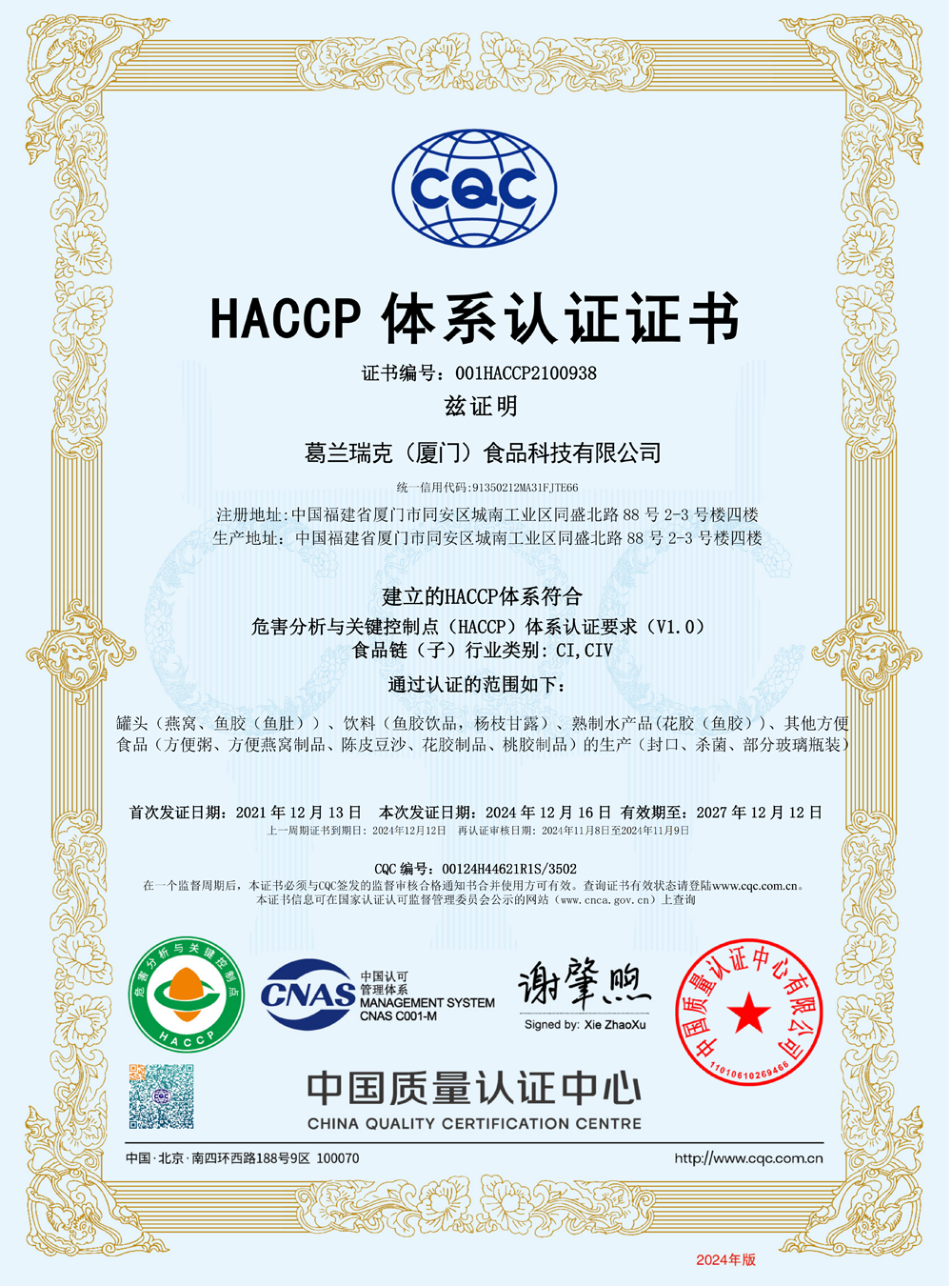 HACCP体系认证证书(中文)