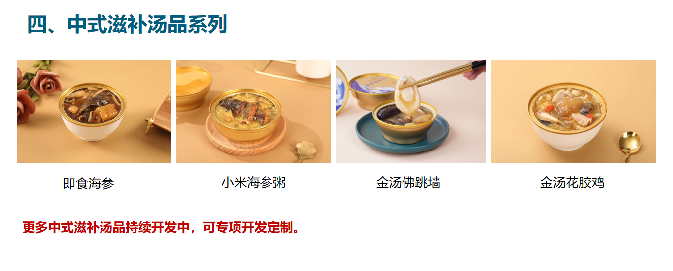 即食海参,小米海参,金汤佛跳墙,金汤花胶鸡,更多中式滋补汤品持续开发中,可专项开发定制。