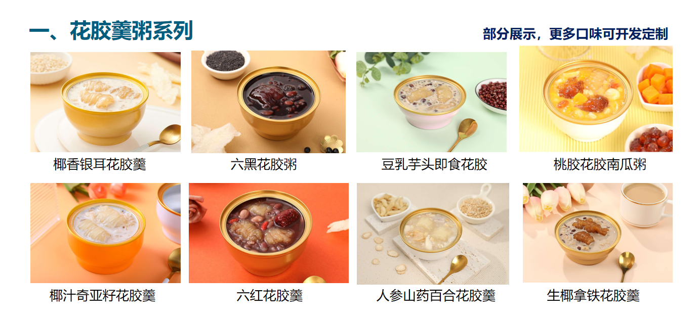 椰香银耳花胶羹,六黑花胶粥,豆乳芋头即食花胶,桃胶花胶南瓜粥,椰汁奇亚籽花胶羹,六红花胶羹,人参山药百合花胶羹,生椰拿铁花胶羹