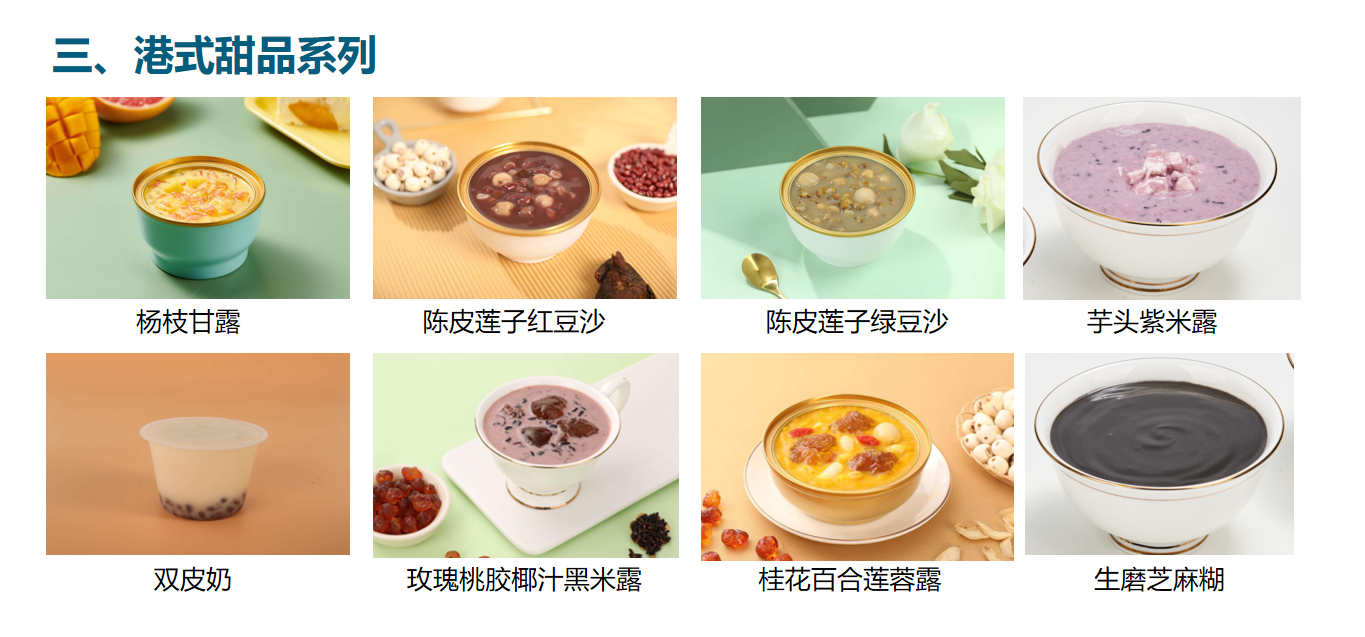 杨枝甘露,陈皮莲子红豆沙,陈皮莲子绿豆沙,芋头紫米露,双皮奶,玫瑰桃胶椰汁黑米露,桂花百合莲蓉露,生磨芝麻糊