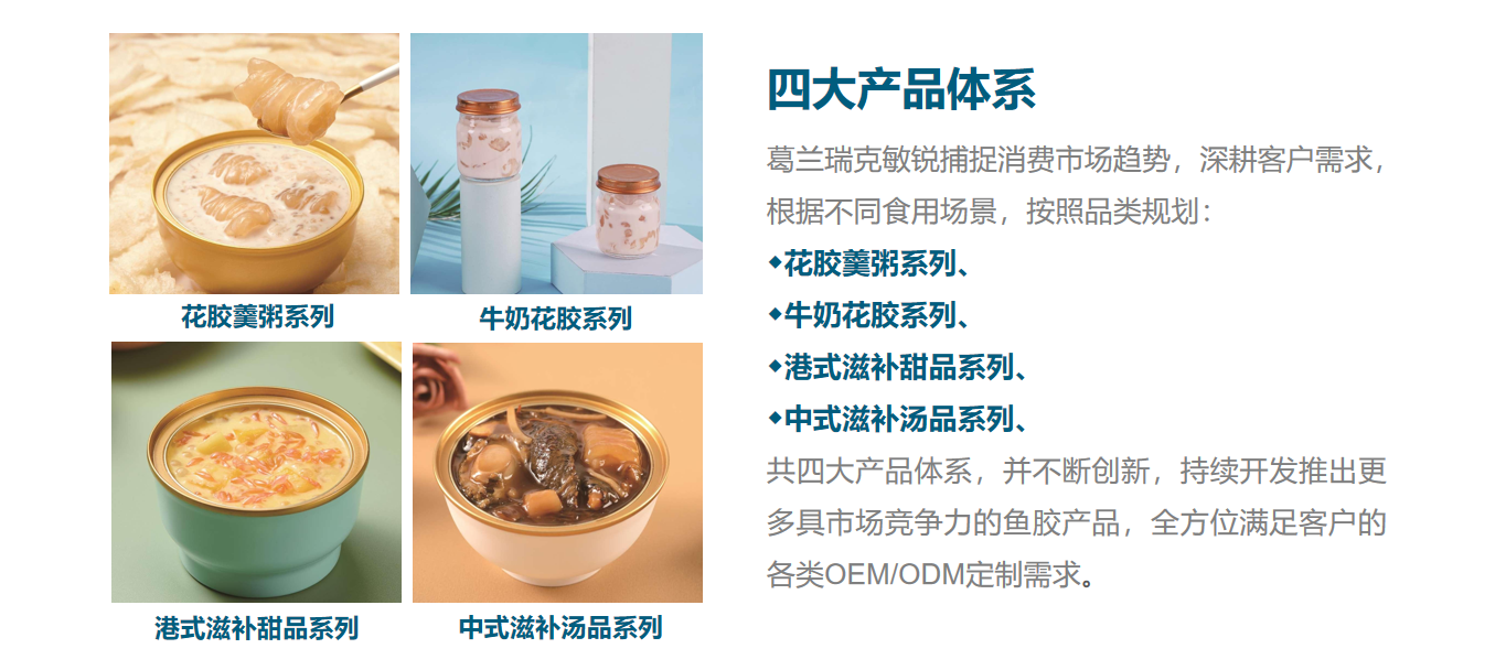 共四大产品体系,并不断创新,持续开发推出更,多具市场竞争力的鱼胶产品,全方位满足客户的,各类OEM/ODM定制需求。,港式滋补甜品系列,中式滋补汤品系列