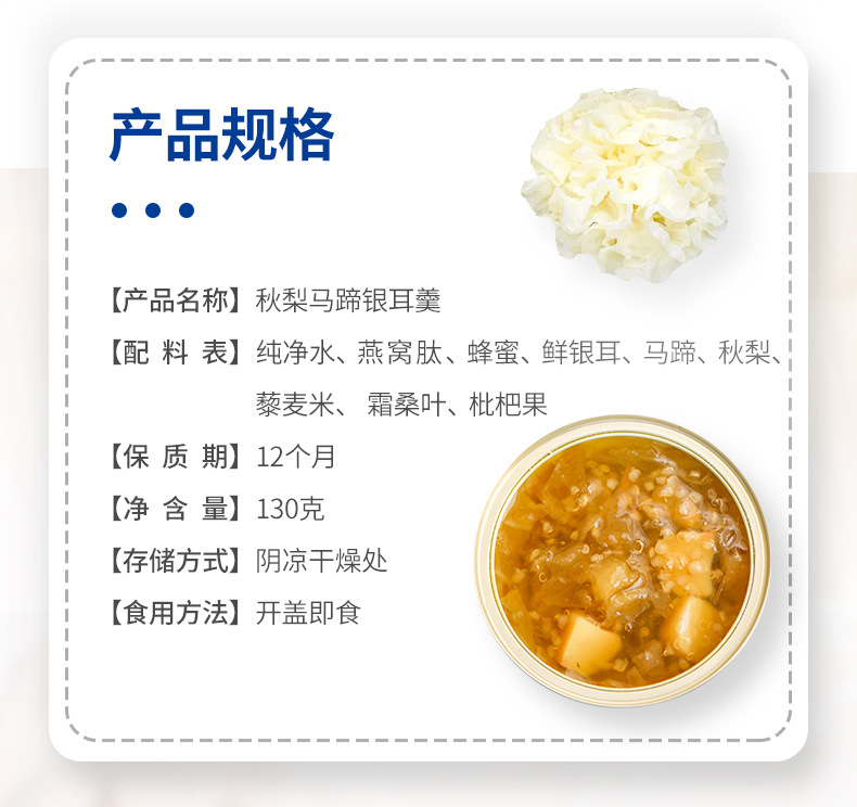 配料表:纯净水、燕麦肽、蜂蜜、鲜银耳、马蹄、秋梨、藜麦米、霜桑叶、枇杷果