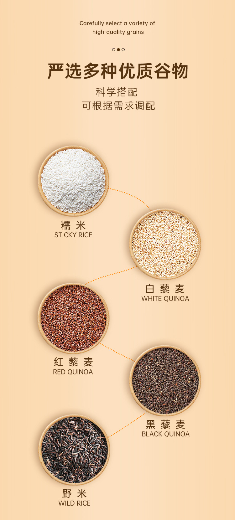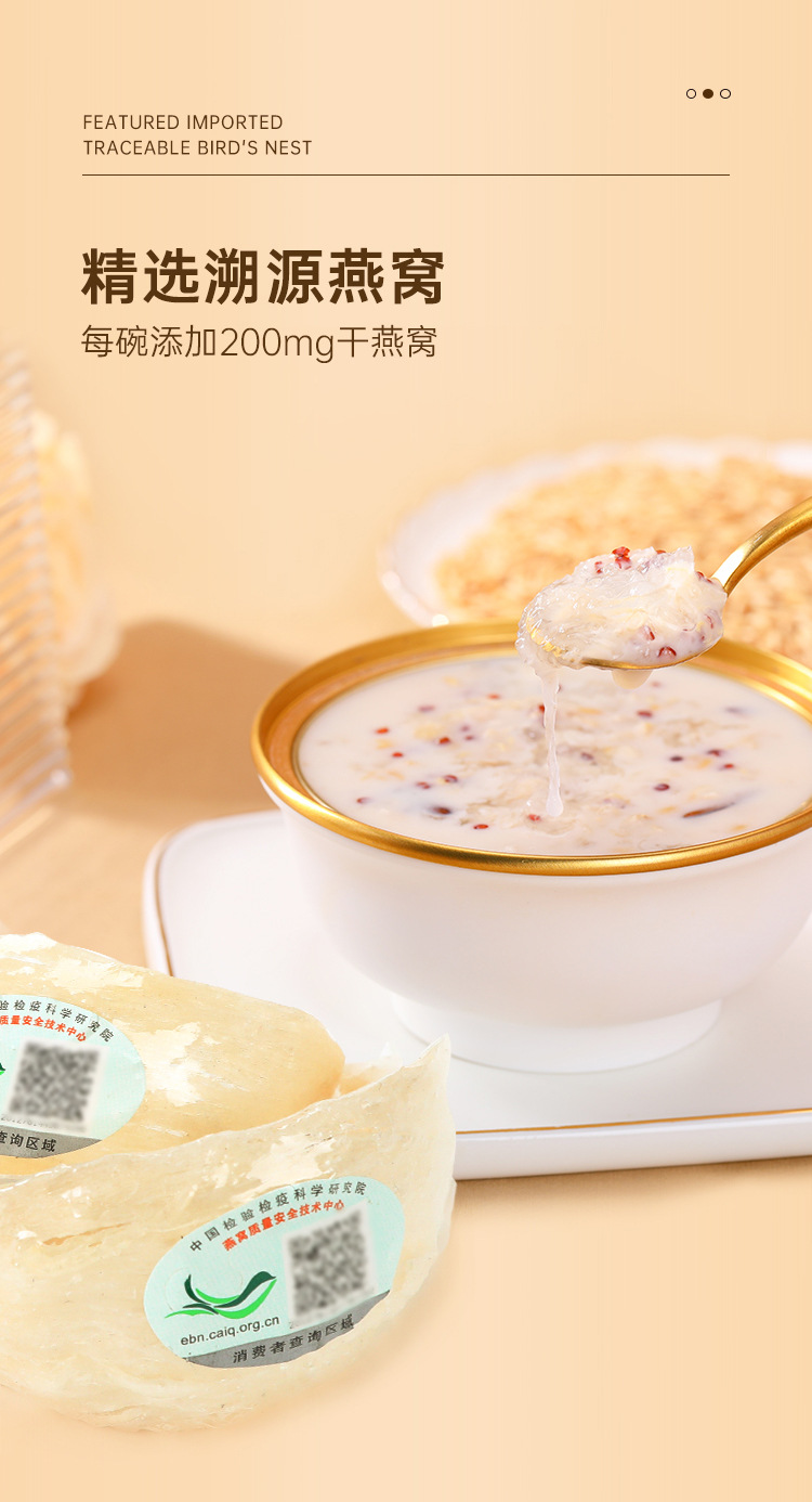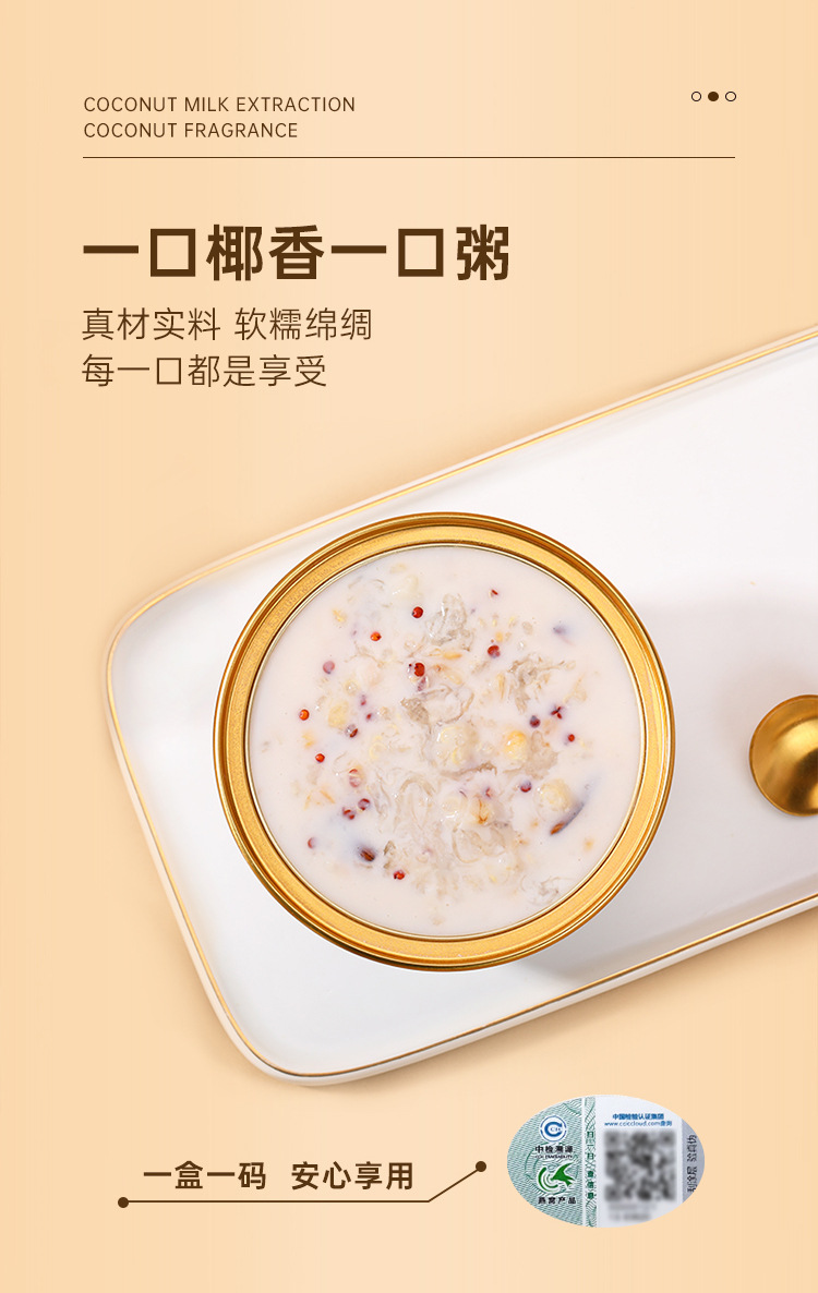 产品配料:纯净水、白砂糖、燕麦粒、椰浆粉、糯米、白藜麦、全脂乳粉、红藜麦、黑藜麦、野米、燕窝、银耳