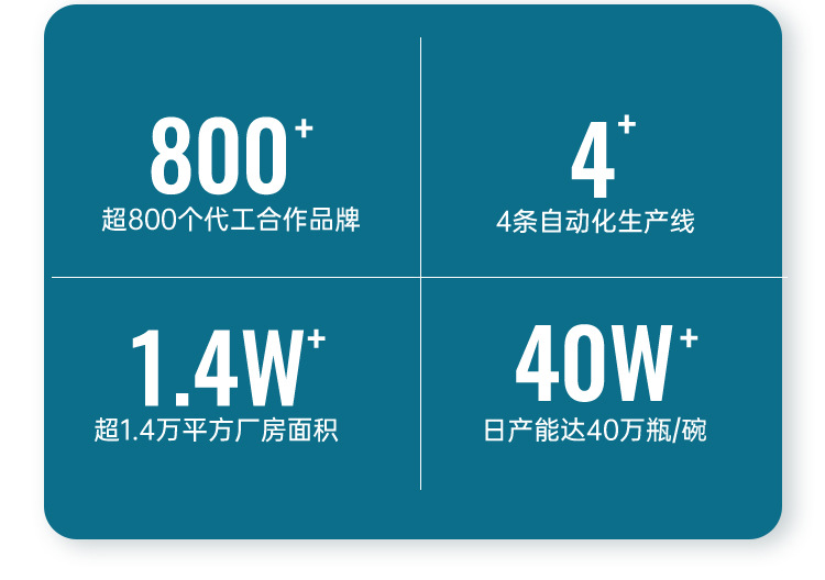 超800个代工合作品牌,4条自动化生产线,超1.4万平方厂房面积,日产能达40万瓶(碗)