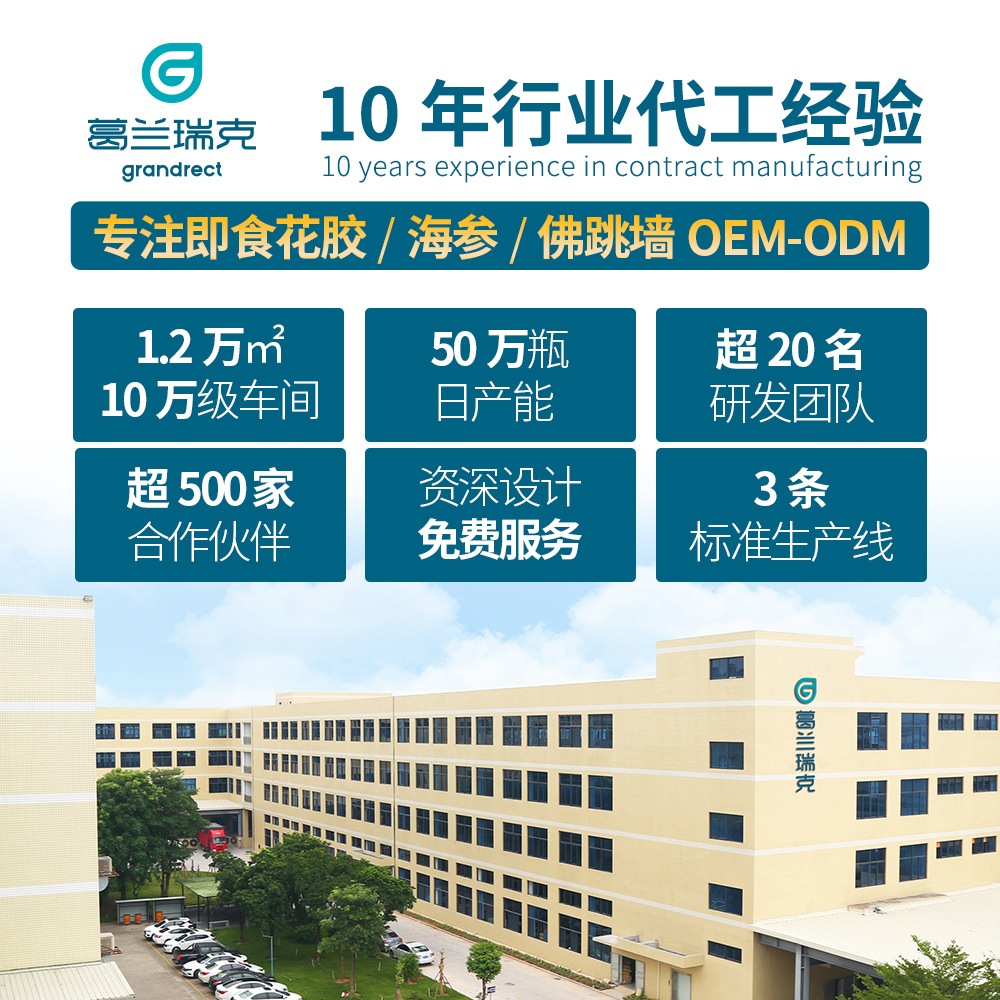 葛兰瑞克,10年行业代工经验,专注即食花胶,海参,佛跳墙OEM,ODM,1.2万平米 10万级车间,50万瓶日产能,超20名研发团队,超500家合作伙伴,资深设计免费服务,3条标准生产线。