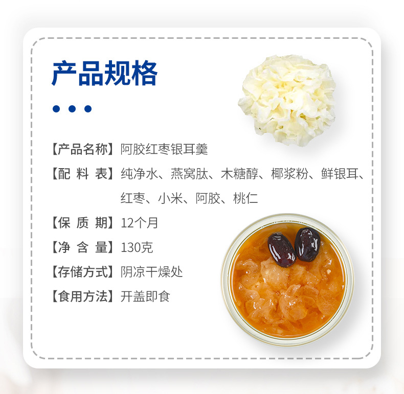 配料表:纯净水、燕窝肽、木糖醇、椰浆粉、鲜银耳、红枣、小米、阿胶、桃仁