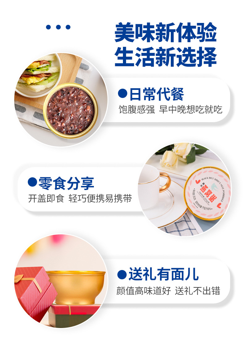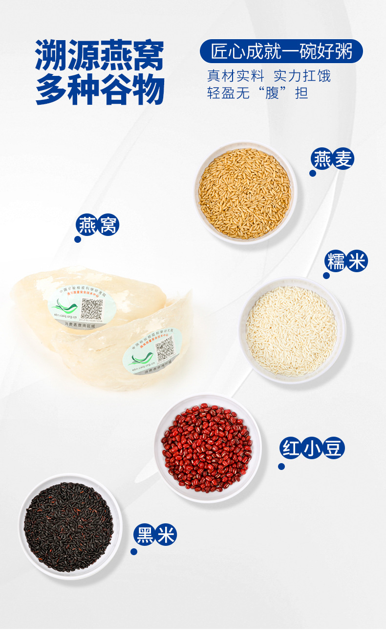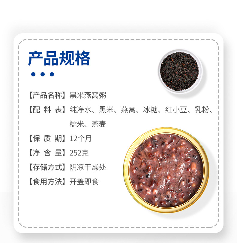 配料表:纯净水、黑米、燕窝、冰糖、红小豆、乳粉、糯米、燕麦