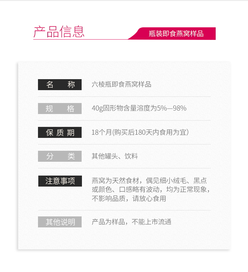 注意事项:燕窝为天然食材、偶见细小绒毛、黑点或颜色、口感略有波动,均为正常现象,不影响品质,请放心食用