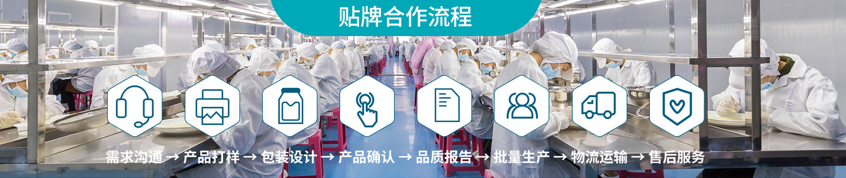 葛兰瑞克(厦门)食品科技有限公司贴牌合作流程:需求沟通、产品打样、包装设计、产品确认、品质报告、批量生产、物流运输、售后服务